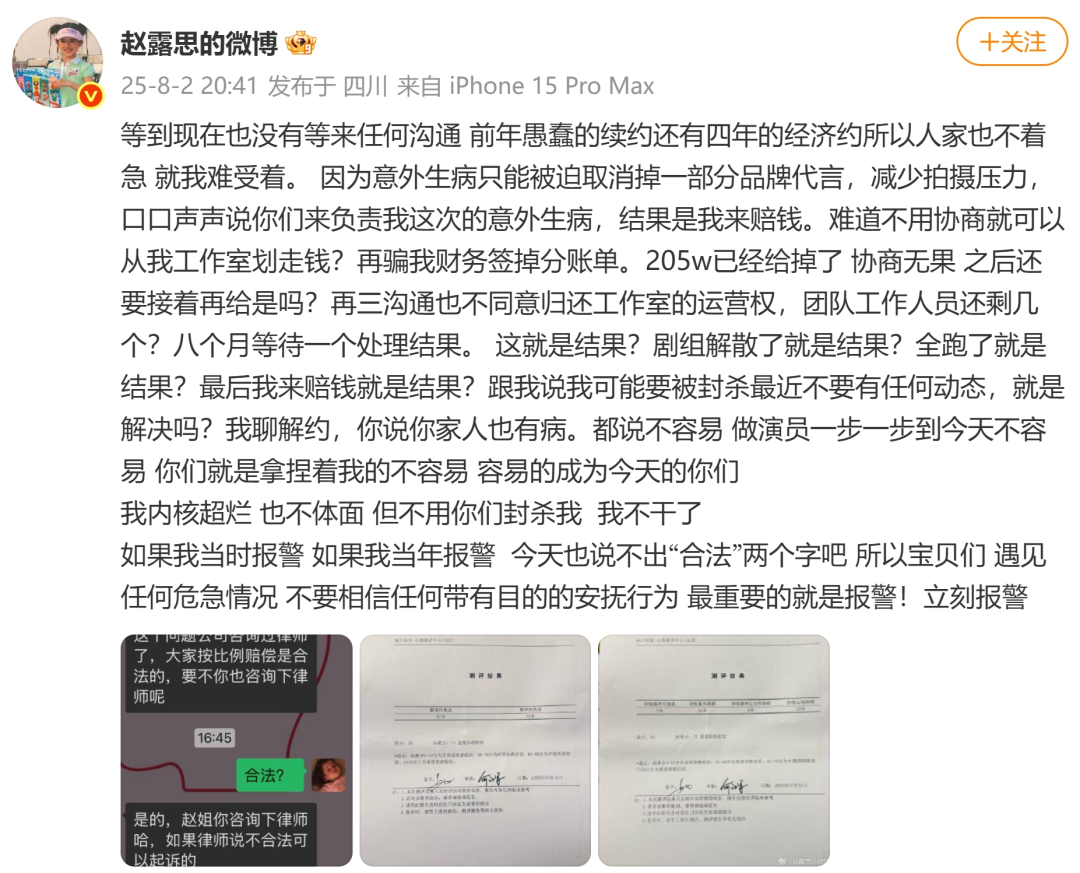 等到现在也没有等来任何沟通,前年愚蠢的续约还有四年的经济约,所以人家也不着急,就我难受着。因为意外生病只能被迫取消掉一部分品牌代言,减少拍摄压力,口口声声说你们来负责我这次的意外生病,结果是我来赔钱。难道不用协商就可以从我工作室划走钱?再骗我财务签掉分账单。205w已经给掉了 协商无果 之后还要接着再给是吗?再三沟通也不同意归还工作室的运营权,团队工作人员还剩几个?八个月等待一个处理结果。 这就是结果?剧组解散了就是结果?全跑了就是结果?最后我来赔钱就是结果?跟我说我可能要被封杀最近不要有任何动态,就是解决吗?我聊解约,你说你家人也有病。都说不容易 ,做演员一步一步到今天不容易,你们就是拿捏着我的不容易,容易的成为今天的你们。
