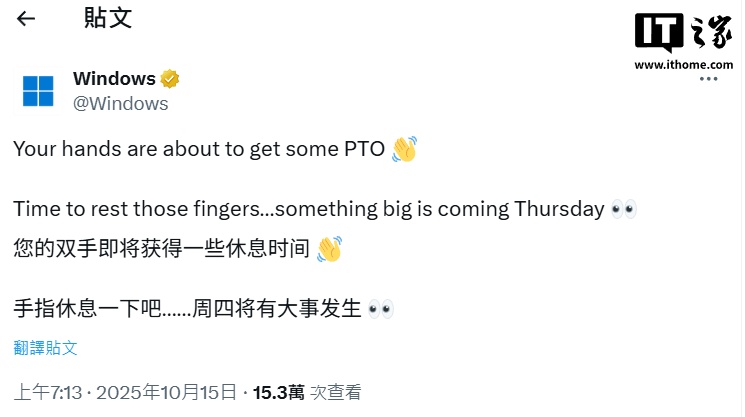 而在今天早上,微软官方在 X 平台发文,暗示明天将公布重大消息。并表示:“你的双手即将‘带薪休假’,周四将有大事发生”。