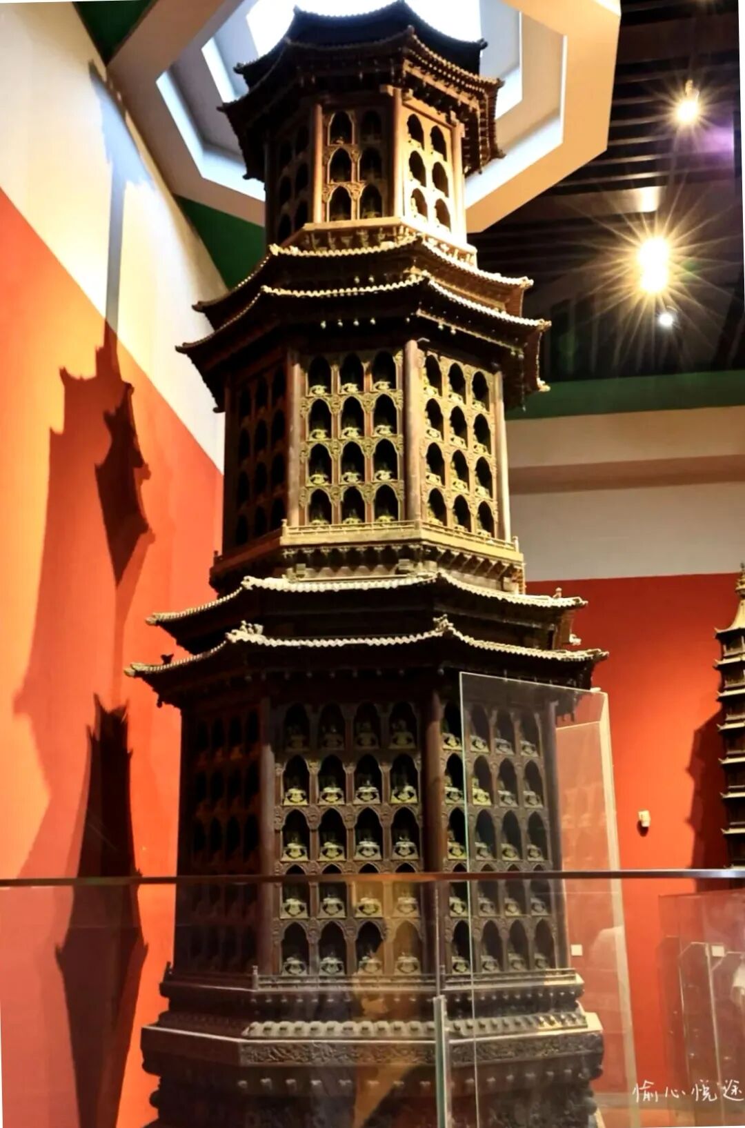 最让人意外的是,二楼还珍藏着从故宫迁来的2000余件文物,其中唐三彩胡人俑反映了唐代洛阳作为国际都会的开放与包容。包括乾隆为其母建造的金丝楠三层木质佛塔,高约六米,结构精巧,塔身雕刻着佛教故事。还有藏传佛像等,都是当时工艺的巅峰之作。